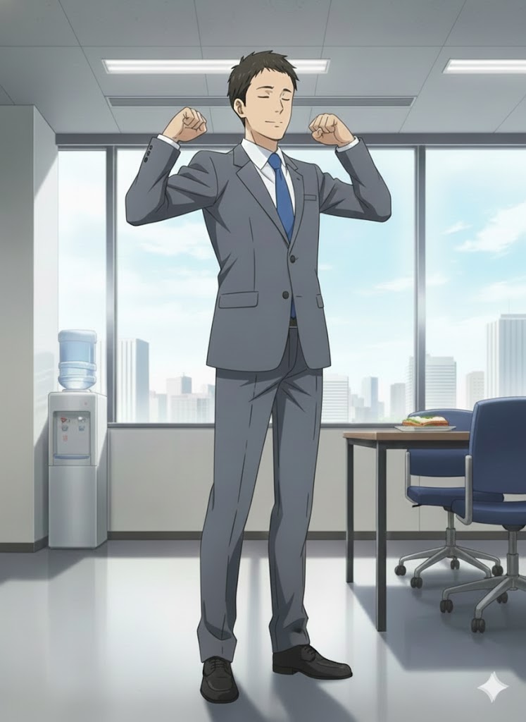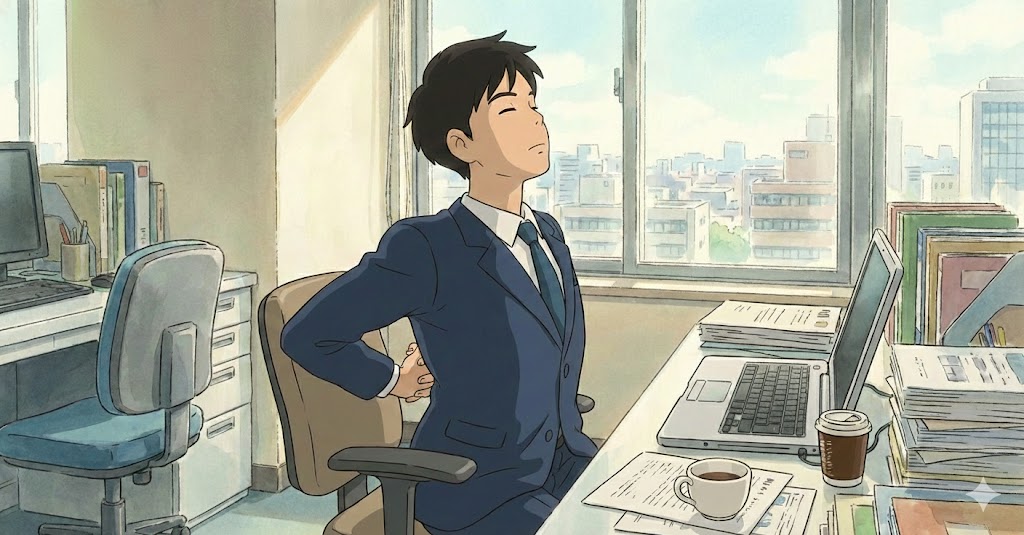 この記事では、新まとめ記事「おじさんの立ち居振る舞い完全ガイド|姿勢と動作で清潔感を出す方法」からの導線として、デスクワーク中でも無理なく続けられる猫背対策ストレッチを紹介します。
