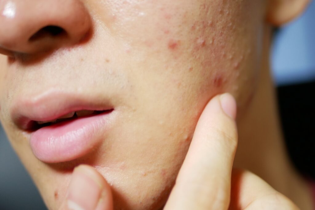 場所も違います。若い頃は額や鼻まわりのTゾーンに出やすいのに対し、大人ニキビはあご・頬・フェイスラインなど下半分に出やすいのが特徴です。